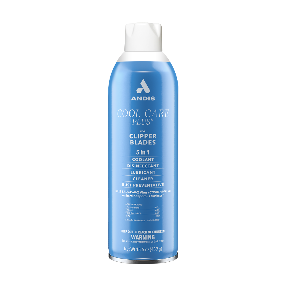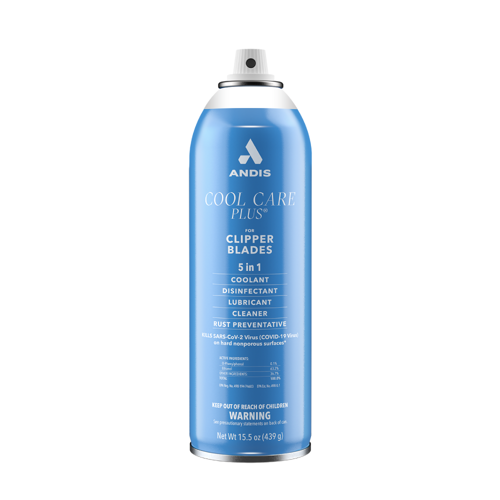 The Andis Cool Care Plus blade spray is a 5 in 1 formula that serves as a lubricant, disinfectant, coolant, cleaner and rust preventive with a country-fresh scent. Designed to enhance clipping action, reduce friction and help to preserve your blades. Special SureGrip™ sculpted can is easy to hold and the high pressure nozzle sprays hair out of blade teeth with ease. Find out more below.