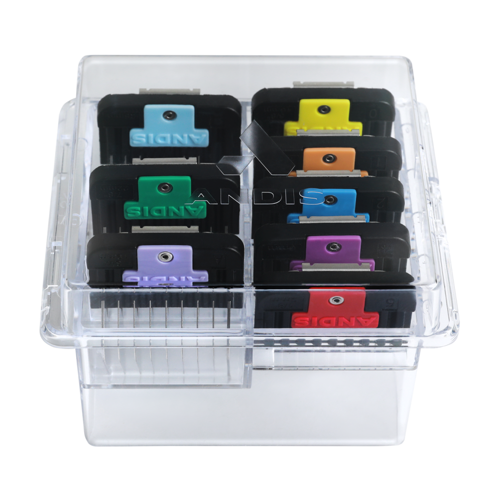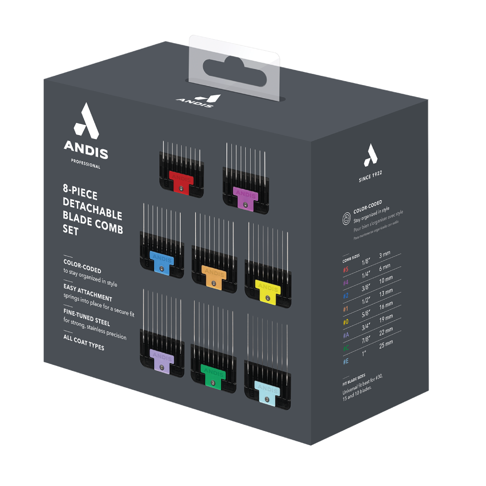 These new Andis set of 8 Universal Stainless Steel comb attachments are designed to fuel creativity and adapt to the varying coat density, bone structure, and temperament of every animal. These ultra-durable stainless steel combs cut through fur more smoothly than plastic attachments, helping achieve lush blends and professional finishes.