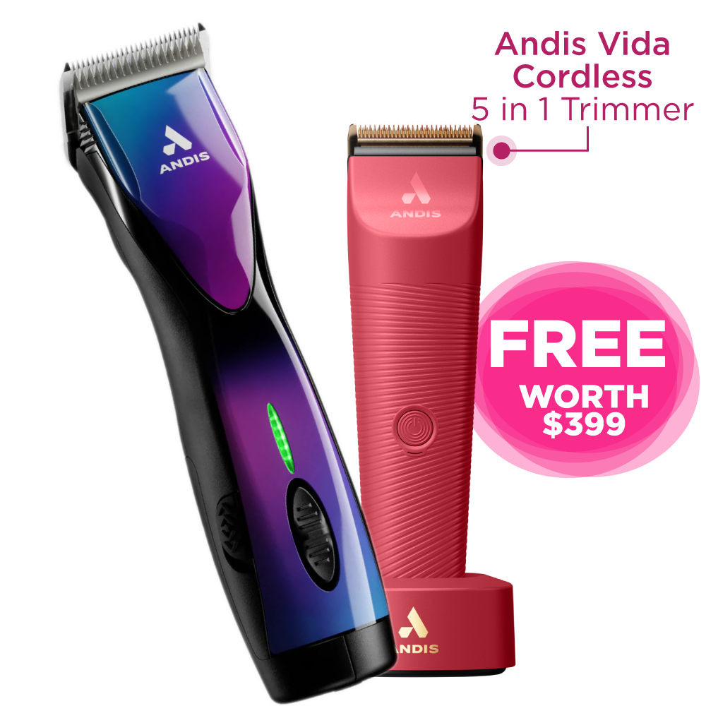 The Andis Pulse ZR II – Galaxy delivers top-tier cordless performance in a bold and vibrant Galaxy colourway. Featuring a high-performance Lithium-ion battery, it offers 5 adjustable speeds (1,800–3,800 SPM) and comes with two removable batteries for up to 6 hours of runtime. Designed for use on all coat types, including matted or coarse coats, this Super Duty clipper is rated for dogs, cats, horses, and livestock. Includes a #10 CeramicEdge blade, charging dock, carry case, and starter oil. The same bestselling performance of the original Pulse ZR II, now with an eye-catching Galaxy design.