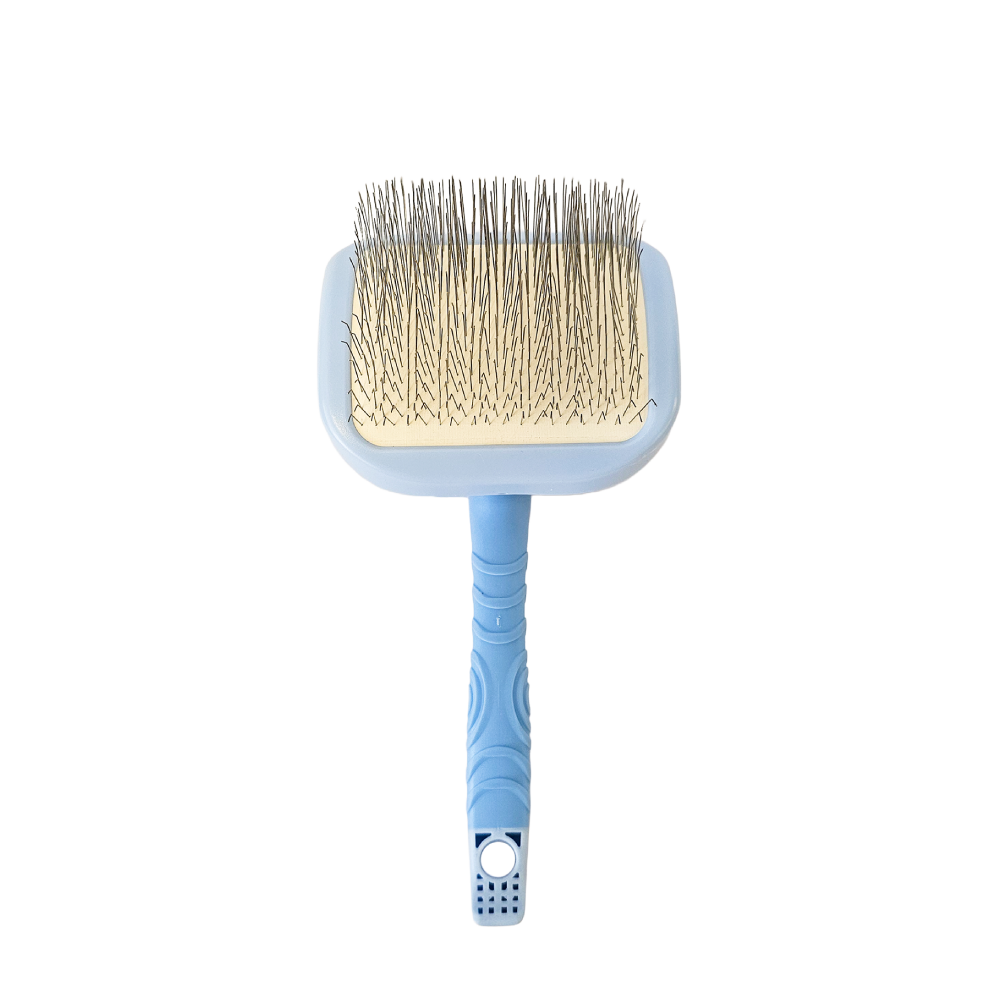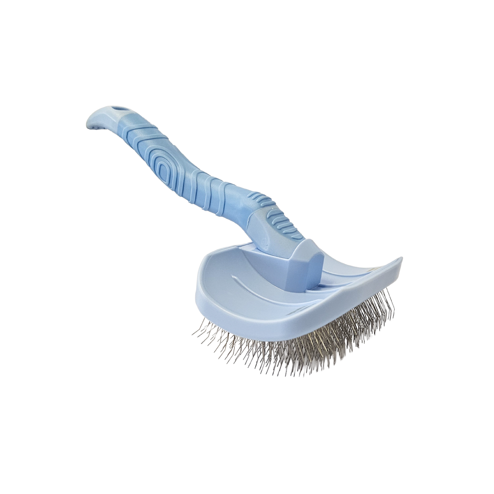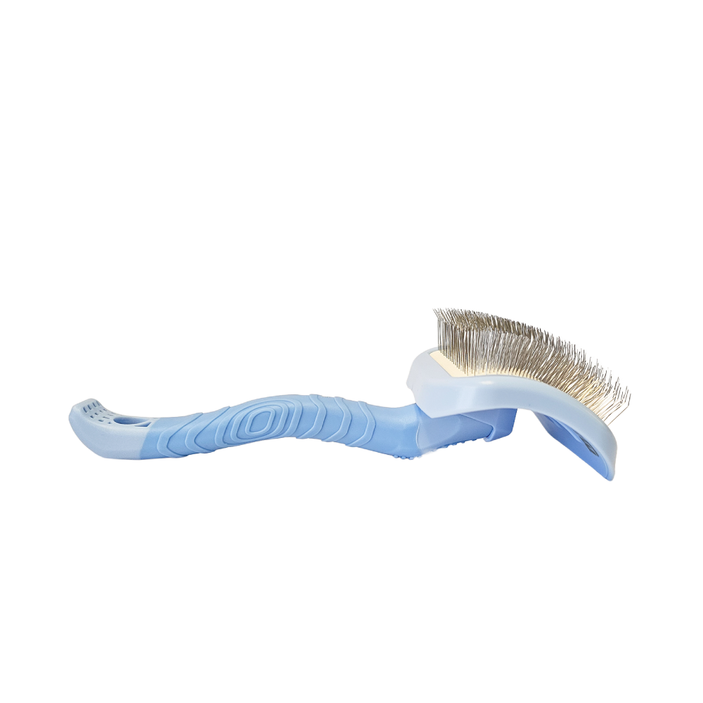 Experience the next level of pet grooming with the World Class Slicker Brush. Expertly designed for professional groomers. This curve slicker combines ergonomic comfort with superior performance to make coat maintenance easy, effective, and gentle on the pet.