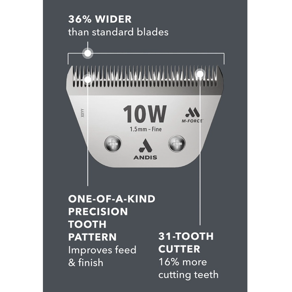 This new release from Andis represents a major leap in blade technology. The new Andis UltraEdge M-Force Wide Blade 30W leaves a 1.5mm coat length, is specifically engineered for professional groomers and large-animal fitters who need to cover more surface area efficiently while maintaining a cool blade temperature. This blade is 36% wider than standard blades, allowing for more coverage per stroke.
